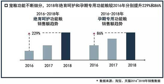 宠粮功能不断细分,如针对绝育和孕期特殊护理需求的功能宠粮出现,且得到消费者的广泛认可。2018年绝育呵护功能粮销售额较2016年提升229%,孕期专用功能粮销售额较2016年提升86%。其中,以功能宠粮代表品牌冠能为例,在进驻天猫平台后,线上销售规模呈爆发式增长。