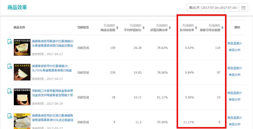 如果只是自己下滑了怎么办? 既然下滑了那么我们就打开单品分析。可以看到通过无线端搜索,能给我们带来多少访客。
