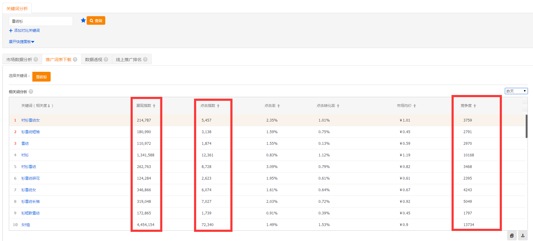 天猫代运营进入直通车流量解析界面。输入我们的核心词,选择推广词表下载,参考展现指数,点击指数和竞争度。展现指数,点击指数即为市场需求,竞争度就是市场竞争。